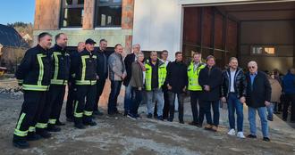 Zur Feier des Richtfestes erschienen zahlreiche beteiligte Baufirmen sowie Planer, Bauleiter und Statiker, besonders stolz hatten sich die Mitglieder der Feuerwehr Grund in der neuen Fahrzeughalle aufgestellt, von den Mitgliedern der Jugendwehr bis zur Einsatzabteilung.