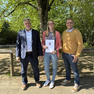 Unser Bild zeigt Esther Weil mit Schulleiter Direktor Herwig Bendl (links) und dem Personalratsvorsitzenden Thomas Degenhardt (rechts).