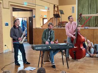 Am Mittwoch vor Himmelfahrt konnten die dritten und vierten Klassen der Reichenberg-Schule ein Streichinstrument hautnah erleben. Ihr Musiklehrer, Herr Fritz, hatte den Jazz-Kontrabassisten Maurice Kühn in die Schule eingeladen, der seinen Kontrabass vorstellte. Zu Beginn konnten die Schüler:innen den Elefanten aus „Karneval der Tiere“ wiedererkennen. Bei diesem Stück zeigte Herr Kühn, wie der Bogen benutzt wird. Im Anschluss haben Herr Kühn, Herr Fritz am Klavier und Sozialpädagoge Uli Anton am Saxophon im allerfeinsten Jazzstil improvisiert und „rumgejamt“. Die Kinder und Lehrer:innen klatschten voll Begeisterung mit. Als Höhepunkt durften einige Schüler:innen selber mal probieren. Streichen mit dem Bogen und Zupfen klappte auf Anhieb. Zoe (3b) hat sogar das Evergreen „Love me Tender“ zum Besten gegeben. Natürlich mit Kontrabassbegleitung. Am Ende konnten die Schüler:innen Liedwünsche äußern, die dann aus dem Stehgreif gemeinsam musiziert wurden. Die Turnhalle platzte fast vor Freude und Spaß an der Musik. Alle Kinder waren begeistert und haben die Instrumentenvorstellung interessiert und aufmerksam verfolgt.