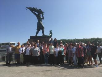 40 fröhliche Teilnehmer freuten sich auf den Ausflug. Zunächst ging es nach Worms und wir hatten mit dem Nibelungenbähnchen eine Stadtführung in Worms, wo uns der Reiseleiter viele Sehenswürdigkeiten zeigte und die historische Bedeutung erklärte. Den Wormser Pfingstmarkt ließen wir links bzw. rechts liegen und versammelten uns zu einem Gruppenfoto am Hagen Denkmal, bevor wir an der Rheinpromenade einkehrten.