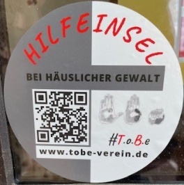 Der Aufkleber signalisiert Betroffenen von häuslicher Gewalt: „Hier bin ich sicher, hier bekomme ich Hilfe“. Ein QR-Code verweist auf die Internetseite des Vereins mit vielen Hilfsangeboten.