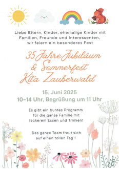 Das gesamte Team der Kindertagesstätte „Zauberwald“ freut sich auf einen tollen Tag und zahlreiche Besucherinnen und Besucher, um gemeinsam das Jubiläum zu feiern und auf 35 Jahre Bildung, Betreuung und Freude zurückzublicken.