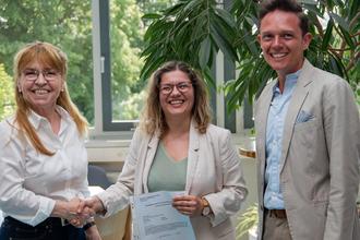 Gemeinsam mit ihr freuten sich im Anschluss an die Examensprüfungen Studiendirektorin Brigitta Gsell (links) als Schulleitungsmitglied in der Prüfungskommission und René Beck (rechts), der Loshaj als Lehrkraft des Vertrauens zur Seite stand.