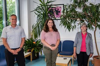 Gemeinsam mit Dittrich freuten sich im Anschluss an deren Prüfungen der stellvertretende Schulleiter Direktor Herwig Bendl (links) sowie die Vorsitzende des Prüfungsausschusses Edith Fasser (rechts). Zu den ersten Gratulanten gehörten ferner Christopher Augustin und Dr. Martin Schmidl, die Dittrich als Mentoren während ihres Vorbereitungsdienstes unterstützend zur Seite standen.