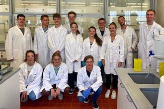 Unser Bild zeigt die Schülerinnen und Schüler des Chemie-Leistungskurses der GAZ mit Studienrat Maximilian Kroworsch im Junior-Labor-Merck.