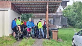 Bei nicht ganz so schönem Wetter bildeten sich, entsprechend der technischen Ausstattung zwei Gruppen. Bio-Bike und E-Bike. Wärend bei der Bio-Bike-Gruppe eine gemäßigte Route eingeschlagen wurde, hatte sich die E-Bike-Gruppe eine ansprechende Runde ausgesucht. Über das Forsthaus Roter Kandel in Richtung Hüttental, um dann über das Sägewerk Monheimer, nach Gras-Ellenbach zu fahren. Von dort ging es über den „alten“ Bahndamm nach Wald-Michelbach, wo u. a. ein Abstecher an das Anwesen des Rennstallbesitzers Jöst erfolgte. Hier war neben der stärksten Steigung ein plötzlich auftretender Regenguß (Bild) zu überstehen. Nach entsprechender Pause wurde der Weg über die Tromm in Richtung Hammelbach fortgesetzt. Vorbei an den Windkraftanlagen auf der Anhöhe des Kahlbergs ging es dann zurück zum Ausgangspunkt der Tour, wo man gegen 12:30 Uhr, z. T. erheblich durchnässt, aber bei guter Laune eintraf. Zwischenzeitlich hatte auch das Bio-Bike-Team den Zielort erreicht.