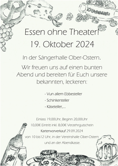 Leider fällt dieses Jahr das Theater in der Vereinshalle aus. Viel bedauern auch, dass sie nicht nur auf das Theater verzichten müssen, sondern auch auf das Essen. deshalb bietet die Sängerlust einen Abend unter dem Motto "Essen ohne Theater" an. Genießen Sie den Schinkenteller, den Käseteller, den Hausmacherteller und den Teller „vun allem Ebbes“ während eines kurzweiligen Abends mit kleinen, feinen Vorführungen. Der Eintritt kostet 10 Euro, darin ist ein Verzehrgutschein von 8 Euro enthalten.