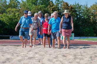 Zu dem Thema „Füße gut – alles gut!“, hat sich Georg Schnellbächer für diese extra Veranstaltung ein besonderes Programm einfallen lassen. Als Platz für die Gymnastik wählte er das Reichelsheimer Stadion „An der Ruh“ für besondere Übungen zum Thema Füße. Wie fühlt es sich an, auf verschiedenen Bodenbeschaffenheiten zu laufen: Rasen, Tartanbahn, Sand in der Weitsprunggrube und Vierfüßlergang auf Betonplatten. Den Abschluss machten Gleichgewichtsübungen auf den Wackelbrettchen.