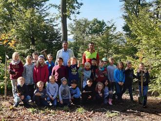 Die Kinder begannen nun die neuen Bäume für das „Grüne Klassenzimmer“ einzupflanzen. Insgesamt acht verschiedene Setzlinge fanden dort ein neues Zuhause. Dabei legten die Kinder selbst Hand an und gruben mit ihren Spaten die tiefen Löcher für die neuen Waldbewohner. Fachmännische Unterstützung erhielten sie von Herrn Kaffenberger, der die Kinder nicht nur an diesem Tag tatkräftig unterstützt hat, sondern auch bei der gesamten Umsetzung dieses Wald-Projektes ein starker Partner für die Reichenberg-Schule ist.