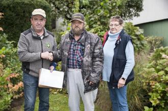 Text zum Foto von Wolfgang Kalberlah: Jaroslav Panek (Mitte), der bei einem Brand sein Wohnhaus verloren hat, nimmt die Spenden dankend vom Schützenvereinsvorsitzenden Adam Hoffarth im Beisein von Roswitha Ratka entgegen, bei der er unterkommen konnte.