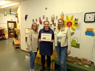 Die Leitung der Kindertagesstätte, Simone Schmidt (links), und die stellvertretende Leitung, Anna-Laura Bundschuh (rechts), nahmen die großzügige Spende stellvertretend für die gesamte Kindertagesstätte entgegen und bedankten sich im Namen des ganzen Teams und der Gemeinde Reichelsheim bei Frau Trautmann.