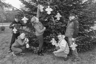 Dietmar und Petra Weber, Christiane Schmidt sowie Ingrid und Jürgen Nicklas (v. l.) befestigen die ersten Engel am Klein-Gumpener Weihnachtsbaum.