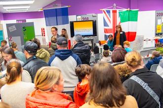Unser Bild zeigt eine Besuchergruppe während des „Tags der offenen Schule“ an der Station „Sprachen“.