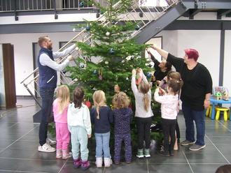 Der Baumschmuck wurde von den Kindern zuvor in der Kindertagesstätte „Zwergenschloss" liebevoll selbst gebastelt und mitgebracht. Mit großem Eifer und viel Freude dekorierten die jungen Gäste den Baum und trugen so zur festlichen Atmosphäre im Autohaus bei.