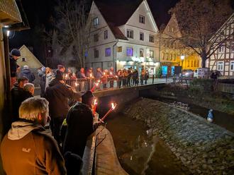 Die Führung wurde von Herrn Hans-Jörg Uther begleitet, der als Wildweibchenpreisträger an jeder Station der Fackelwanderung kleine Geschichten und Märchen zu den jeweiligen Märchenfiguren zum Besten gab. Der Weg führte die Teilnehmer vom Eisen-Treusch Parkplatz über die Bismarckstraße zur Reichenberghalle, vorbei am Moses-Brünnchen bis hin zum Rathaus. Zu sehen gab es dabei einen Biber, ein Schwein, den Froschkönig, Fuchs und Gans, einen Wolf, ein Bär, Hase und Igel, eine Eule und das Wildweibchenrelief.