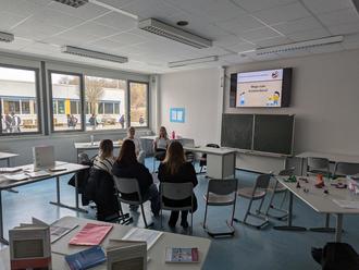 Eine Leiterin des Leitungsteams sowie eine Erzieherin der Kindertagesstätte "Auenland" nahmen sich die Zeit, den Schülerinnen und Schülern einen Einblick in ihren Arbeitsalltag zu geben, die verschiedenen Facetten dieses wichtigen Berufsfeldes zu präsentieren und die verschiedenen Möglichkeiten der Berufsausbildung aufzuzeigen.