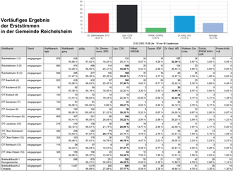Die in der Tabelle dargestellte Wahlbeteiligung in den einzelnen Wahlbezirken bezieht sich auf die vor Ort abgegeben Stimmen im jeweiligen Wahllokal. Stimmen die per Briefwahl aus den einzelnen Wahlbezirken eingegangen sind, können für die Berechnung der Wahlbeteiligung in den jeweiligen Wahlbezirken nicht herangezogen werden.