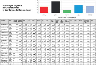 Hiermit veröffentlicht die Gemeindeverwaltung das vorläufige Ergebnis der Bundestagswahl 2025 in Reichelsheim. Die Wahlbeteiligung in Reichelsheim betrug insgesamt 84,53 %. Bei der Bundestagswahl 2021 lag die Wahlbeteiligung in Reichelsheim bei 77,24 %.