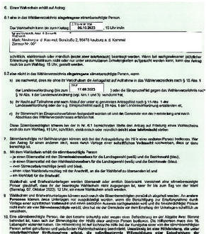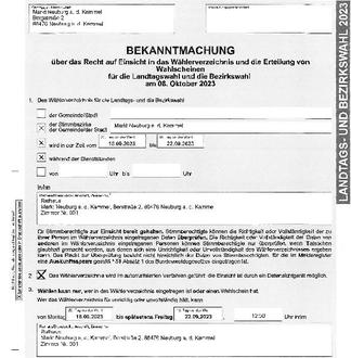 über das Recht auf Einsicht in das Wählerverzeichnis und die Erteilung von Wahlscheinen für die Landtagswahl und die Bezirkswahl am 08. Oktober 2023