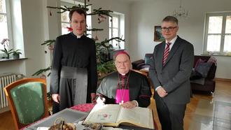 Bischof Bertram hat sich im Rahmen seines Besuches in das Golden Buch des Marktes Neuburg eingetragen.