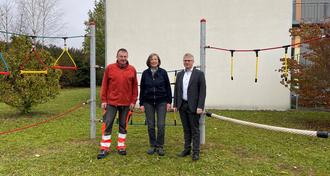 Wolfgang Mahler (Bauhof), Rektorin Inge Geprägs, Erster Bürgermeister Markus Dopfer vor dem neuen Klettergerüst