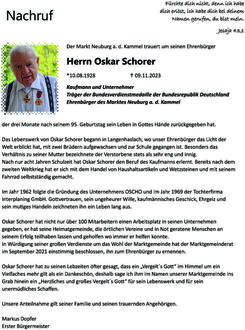 Oskar Schorer hat nicht nur über 100 Mitarbeitern einen Arbeitsplatz in seinen Unternehmen gegeben, er hat seine Heimatgemeinde, die örtlichen Vereine und in Not geratene Menschen an seinem Erfolg teilhaben lassen und geholfen wo immer er helfen konnte. In Würdigung seiner großen Verdienste um das Wohl der Marktgemeinde hat der Marktgemeinderat im September 2021 einsmmig beschlossen, ihn zum Ehrenbürger zu ernennen.