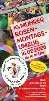 Am 16.02.2026 um 16:16 Uhr ist es wieder soweit. Zum zehnten Mal schlängelt sich auch dieses Jahr wieder der Rosenmontagsumzug durch die Straßen von Muhr am See. Der Muhrer Faschings-Gaudi e.V. hat wieder ein buntes Programm aus Guggenmusik, auswärtigen Gruppen und altbekannten Teilnehmern zusammengestellt. Am Anschluss an den Umzug darf im Schützenhaus gut gelaunt weiter gefeiert werden.