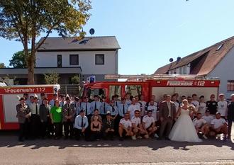 Das Brautpaar im Kreise der Muhrer Feuerwehr, des Schützenvereins und des 1. FC Altenmuhr