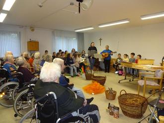 Flötenklang, Blätter rascheln, Herbstlieder und verschiedene Orffinstrumente klangen durch den Raum. Dazu dann die sichtbare Freude und Fröhlichkeit der Kinder, da ging das Herz von jedem Bewohner auf.