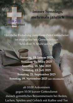 | 10.30 Uhr | Gute-Zeit-Gottesdienst im Gemeindehaus |
