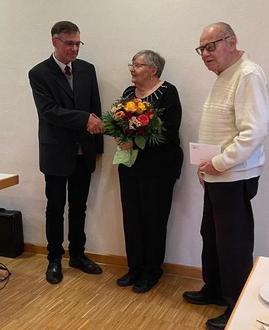Im Rahmen eines Mitarbeiternachmittags wurde das Ehepaar Hermann und Barbara Zimmer offiziell aus dem Hausmeisteramt am evangelischen Gemeindehaus in Muhr am See verabschiedet. Barbara und Herrmann Zimmer - beide haben inzwischen das 85. Lebensjahr überschritten - kümmerten sich fünfundzwanzig Jahre lang um das Gemeindehaus. Dabei ging es nicht nur um Straße kehren und Schnee räumen oder Tische und Stühle zu stellen und das Haus sauber zu halten, sondern auch um Kaffee kochen und Gebäck besorgen für die Veranstaltungen im Haus usw. Bekannt war der immer der Kirchenjahreszeit angepasste Tischschmuck und der Schmuck im Haus. Pfarrer Brendel bedankte sich für den treuen Dienst der Eheleute Zimmer und überreichte einen Blumenstrauß und ein Geschenk.