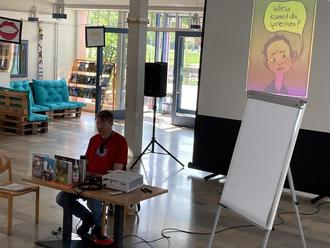 Nachdem der sympathische Autor mit vielen Fragen gelöchert worden war, die er bereitwillig beantwortete, wurde er von den Kindern geradezu angebettelt ein weiteres Comicbuch vorzustellen. Dem kam Herr Wirbeleit gerne nach und las den ersten Band der Reihe „Gorm Grimm“ vor, in dem es um einen computerspielbegeisterten Jungen geht, der durch Magie auf einen starken, etwas einfältigen Wikingerjungen aus der Vergangenheit trifft.