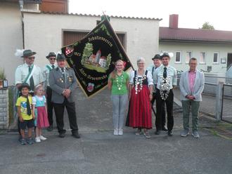 Schützenmeister Paul Kümpflein konnte zur Königsfeier bei strahlendem Sonnenschein dann auch zahlreiche Teilnehmer begrüßen. Besonders begrüßte er Ehrenschützenmeister Alfred Messerer und die Ehrenmitglieder Anni Langner, Willy Weißel, Günter Szudlo und Heiner Bickel. Die Arberger Blaskapelle begleitete den Festzug musikalisch und ein paar Männer der Feuerwehr Altenmuhr sicherten diesen ab. Wie jedes Jahr waren die Namen der neuen Könige ein gut gehütetes Geheimnis. Sogar die Jugendkönigin Hannah Fitzner, erste Station des Festzuges, wusste bis dahin nichts von ihrem Königsschuss. Ihre Eltern und deren Freunde konnten die Vorbereitungen heimlich durchführen und somit war Hannah völlig überrascht von der Königswürde. Sie errang diese mit einem 144,4 Teiler vor Linda Resl (268,6 T.). Janne Schneider übergab die Königskette an die neue Jugendkönigin und deren Eltern luden, nach dem dreifachen Schützen-Heil, die Anwesenden zu einem Imbiss ein. Nach kurzem Aufenthalt zog man zur Damenkönigin weiter. Schnell war klar, dass sich in dieser Klasse Waltraud Eischer mit dem besten Schuss des ganzen Königsschießens durchsetzen konnte. Sie errang den Titel der Damenkönigin mit einem 72,4 Teiler. Vorjahres-Königin Natascha Gröger wurde Vizekönigin (295,7 T.) und überreichte der neuen Königin die Königskette. Auch Waltraud Eischer wurde mit einem dreifachen Schützen-Heil geehrt und in deren gemütlichen Garten verweilte die Gesellschaft zu einem Umtrunk. Danach erfolgte der Marsch zum König. Die Überraschung war groß, als man in den Hof von Johannes Uhlmann einbog, denn dieser war amtierender König 2022 und konnte seinen Titel mit einem 266,9 Teiler erfolgreich verteidigen. Vizekönig wurde Vereins-Fahnenträger Andreas Schmidt (405,3 T.). Nach Übergabe der Königskette durch Schützenmeister Paul Kümpflein und dem dreifach "Schützen-Heil" verweilte man auch hier gut versorgt mit Getränken und Knabbereien. Dann erfolgte der Rückweg ins Schützenhaus, wo Bürgermeister Dieter Rampe die neuen Könige in Empfang nahm und ihnen die Glückwünsche der Gemeinde überbrachte. Die Arberger spielten, ebenfalls schon Tradition, zum Königswalzer auf und das neue Königspaar ließ sich dazu nicht lange bitten. Zum gemeinsamen Abendessen gab es ein Spanferkel, vorzüglich zubereitet von Grillmeister Harry Meier. Nach dem offiziellen Teil klang der Abend dann gemütlich im Schützenhaus aus.