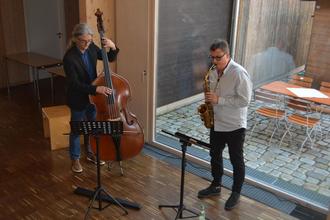 Die musikalische Umrahmung der Vernissage übernahm das Jazzduo mit Harald Dösel am Saxophon und Winnie Neumann am Kontrabass.