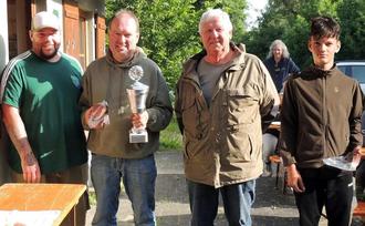 Die Gewinner vom Nachtangeln auf Aal und Waller, Heinz Haschke (mit Pokal) und Janne Schneider, 2. Vorstand Christian Leng (links) und 1. Vorstand Robert Walz (mitte)