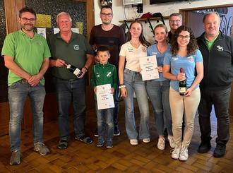 1. Schützenmeister Paul Kümpflein und 2. Schützenmeister Sigi Semsch mit den Gewinnern der Dorfmeisterschaft