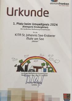 Die Kita St. Johannis darf sich über eine besondere Auszeichnung freuen: Die Fuchsgruppe unter der Leitung der Erzieherinnen Celine Kamm und Katharina Girschele hat den Umweltpreis 2024 des Landkreises Weißenburg-Gunzenhausen gewonnen. Unter insgesamt 20 Bewerbungen setzte sich ihr Projekt zum Thema „Wasser“ durch und erreichte den 1. Platz. Als Anerkennung für ihre hervorragende Arbeit freute sich die Kita über ein Preisgeld von 400 Euro.
