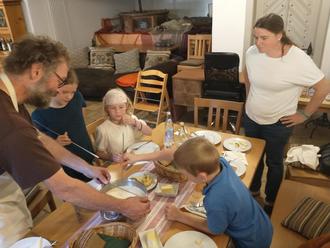 Wenn Engel auf Reisen gehen, war der erste Satz, als sich die Sängerinnen und Sänger mit Ihrem Chorleiter Helmut Richter am Samstag, 16.09.23 am Dorfplatz in Muhr am See trafen. Einige kamen in Begleitung Ihrer Männer, Frauen und Kinder. Und in dieser schönen Gruppe fuhren wir in privaten Fahrgemeinschaften zur Schmalzmühle (bei Röckingen) zum Erlebnis-Käse-Wohlfühlhof der Fam. Friedrich König. Fritz, so wird er von allen genannt, begrüßte uns auf seine humorvolle Art und wir wussten sofort, der passt zu uns. Nach kurzer Erklärung des weiteren Ablaufes wurden wir in die Kunst des Käse machens eingeführt. Und dann ging es auch schon los. Eine der wichtigsten Aufgaben hatten die „Deckellupfer,“ aber auch das Abmessen und einrühren von Lab in die Milch, sowie Geschick beim Schneiden der Würfel und das lockern per Hand vom Käsebruch stellten nicht nur die Erwachsenen sondern auch die Kinder unter der Aufsicht vom Fritz mit bester Zufriedenheit unter Beweis.