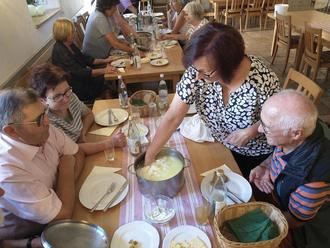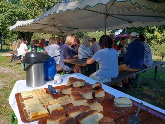 So kamen wir Schritt für Schritt unserem selbstgemachten Käse immer näher. Zwischen den Ruhephasen der Käseherstellung ließen wir uns bei einer Käsebrotzeit den Hauseigenen Frisch-Weich und Hartkäse schmecken, was zur Folge hatte, dass wir uns vom Hofladen der Fam. König mit Käse für zu Hause eindeckten. Die kurzweiligen Stunden vergingen wie im Fluge und bevor wir unseren Ausflug fortsetzten, bedankte sich der gem. Chor mit einem Ständchen. Dann kam die Frage auf, wo gibt`s etz an Kaffee, denn das war bis zuletzt ein Geheimnis! Wir setzten unsere Fahrt fort durch Gerolfingen, Beyerberg und am Kappelbuck war das Ziel erreicht. Inmitten wunderschöner Natur und umgeben von einer 27 ha großen Steuobstwiese war für uns der Kaffeetisch unter Bäumen gedeckt. Wir bekamen eine Führung in den Eiskeller und zum noch lauwarmen Holzbackofen, in dem Stunden vorher unser Hefegebäck, Mohn-Käse und Apfelkuchen gebacken wurde.