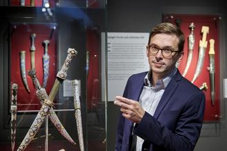 Dr. Marcus Pilz in der Ausstellung „Gold & Damaszenerstahl“