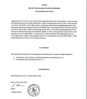 Aufgrund der Gesetzesänderung und nicht mehr geltenden Hebesätze ist die Gemeinde verpflichtet, eine neue Hebesatzsatzung zu erlassen. Diese Satzung wurde in der Gemeinderatssitzung am 28.10.2024 beschlossen.