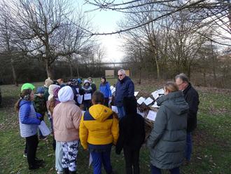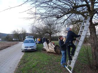 Die Kinder der 4. Klasse machten sich zu Fuß mit ihrer Lehrerin Frau Beck auf den Weg Richtung Roth und trafen die Initiatoren „naturnahe Wiese“ auf eben diesem gemeindlichen Grundstück nahe des Füllbachs. Fünf Ruheständler hatten dort die Montage der Nisthilfen vorbereitet. Die Kinder erfuhren in einer „Freilichtschulstunde“ allerlei Wissenswertes über das Vorhaben „naturnahe Wiese“ von Harald Ostrow, er hat dazu kurzerhand einen Totholzstamm zur Tafel umfunktioniert. Die weiteren Helfer montierten währenddessen die elf Nistkästen mit Leitern an den Bäumen auf der gemeindlichen Streuobstwiese. Da die Kästen nummeriert sind, weiß nun jedes Kind, an welchem Baum sein Vogelhäuschen hängt. Gerade als die Klasse den Rückweg zur Schule antreten wollte, haben die Kinder schon die ersten Meisen entdeckt, welche die Kästen inspizierten.