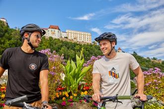Burg.Museen.Bayern_Passau.jpg: Radelnd Bayerns Burgen erobern, hier vor der Veste Oberhaus mit dem Oberhausmuseum Passau, © Oberhausmuseum Passau / Marcel Peda