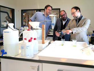 Deshalb ist SPT so schwer: Dr. Sebastian Kamps zeigt Sebastian Straubel und André Dehler (von rechts) die Eigenschaften der in Zeickhorn hergestellten Labor-Lösung. Foto: Landratsamt Coburg / Berthold Köhler
