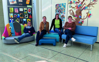 Rektorin Frau Anja Beck (2. von links) und die fleißigen Damen vom Basarteam testen die neuen Sitzgelegenheiten. Foto: Schule