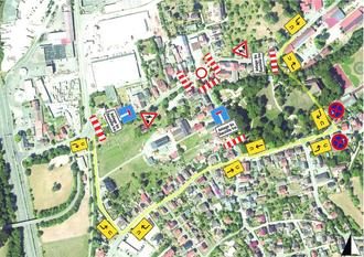 Die Umleitung des Verkehrs erfolgt über die Ortsstraßen Bahnstraße, Simonsgasse, Parkstraße, Schloßstraße und Rother Straße bzw. umgekehrt. Der Anliegerverkehr ist in Absprache mit der Baufirma bis zur Baustelle möglich.