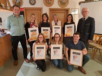 vordere Reihe kniend von links: Rita Schick, Franziska Hubel, Leon Zühlke - alle 10 Jahre hintere Reihe von links: Posaunenchorleiter Klaus Zühlke, Melanie Scherb (25 Jahre), Andrea Böswald (40 Jahre), Susanne Linsenmeyer (10 Jahre), Christina Haas (25 Jahre), Bezirksobmann Pfarrer Reinhard Caesperlein es fehlen auf dem Bild: Nico Zühlke (10 Jahre) und Andrea Hönle (25 Jahre)