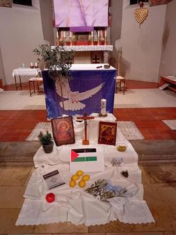 In ökumenischer Verbundenheit feierten wir den Weltgebetstagesgottesdienst dieses Jahr in der Kath. Herz-Jesu-Kirche. Schon 2017 wurde Palästina für das Jahr 2024 ausgesucht und das dortige WGT-Komitee hat viel Arbeit in die Vorbereitung gesteckt, Texte und Lieder ausgesucht. Dann kam am 7. Oktober 2023 der grausame und unfassbare Terroranschlag der Hamas und Militäreisätze Israels im Gasastreifen mit vielen Toten. Friede im Heiligen Land - eine Illusion?