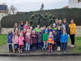 Der Obst-und Gartenbauverein Mündling stellte auch heuer wieder am Westenbrunnen die frisch gebundene Osterkrone auf. Geschmückt wurde sie erstmals mit vielen bunt gefärbten Eiern, die von den Mündlinger Kindern im Rahmen des Ferienprogramms mit viel Freude und Eifer angefertigt wurden. Am Osterbrunnen konnten die Mädchen und Jungs nun ihre Werke besichtigen und wiederfinden. Die Vorstandschaft bedankte sich recht herzlich bei den Kindern für die Hilfe und 1. Vorsitzende Claudia Hammel überreichte jedem Kind als Dankeschön einen Schoko-Osterhasen.