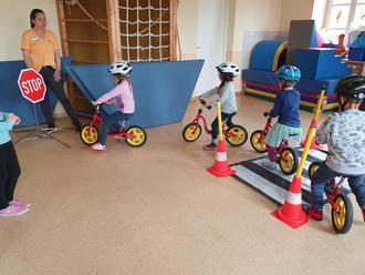Im „Bewegungsparcour“ konnten die Kinder auf Laufrädern den Zebrasteifen überqueren, mussten dabei auf Verkehrszeichen und Fußgänger achten.
